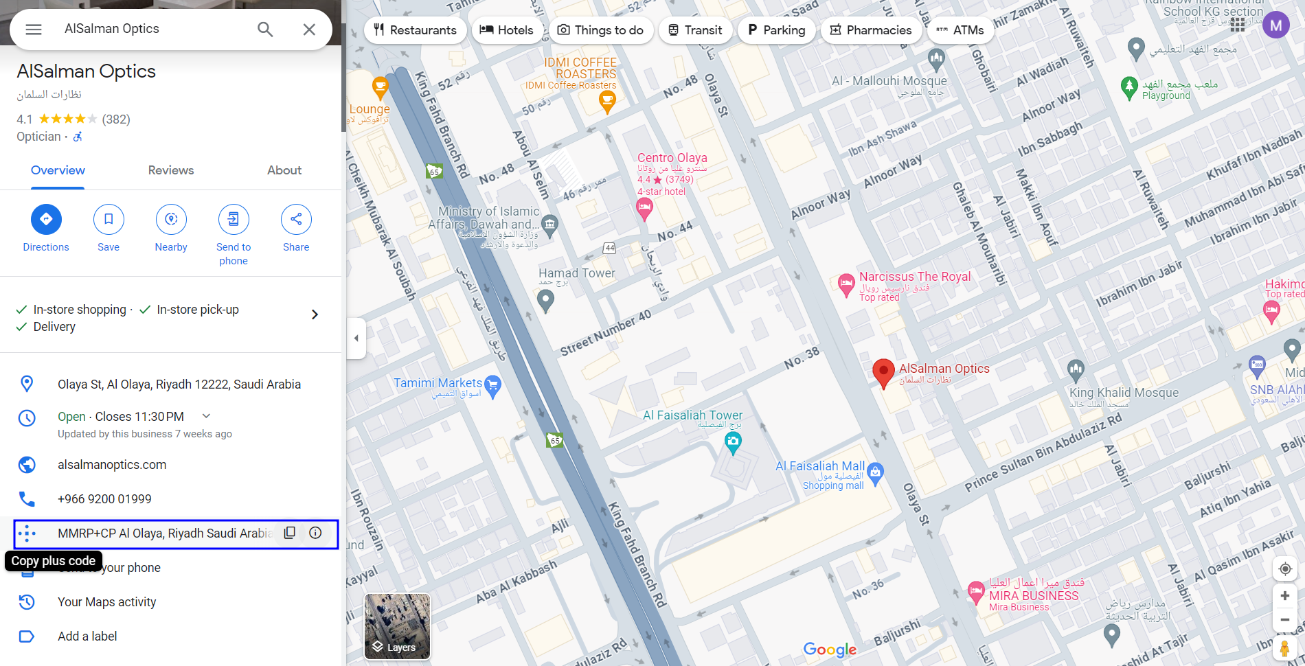 - The Plus Code will appear in the location details. It typically looks like a combination of letters and numbers, for example, "MMRP+CP Al Olaya, Riyadh Saudi Arabia"